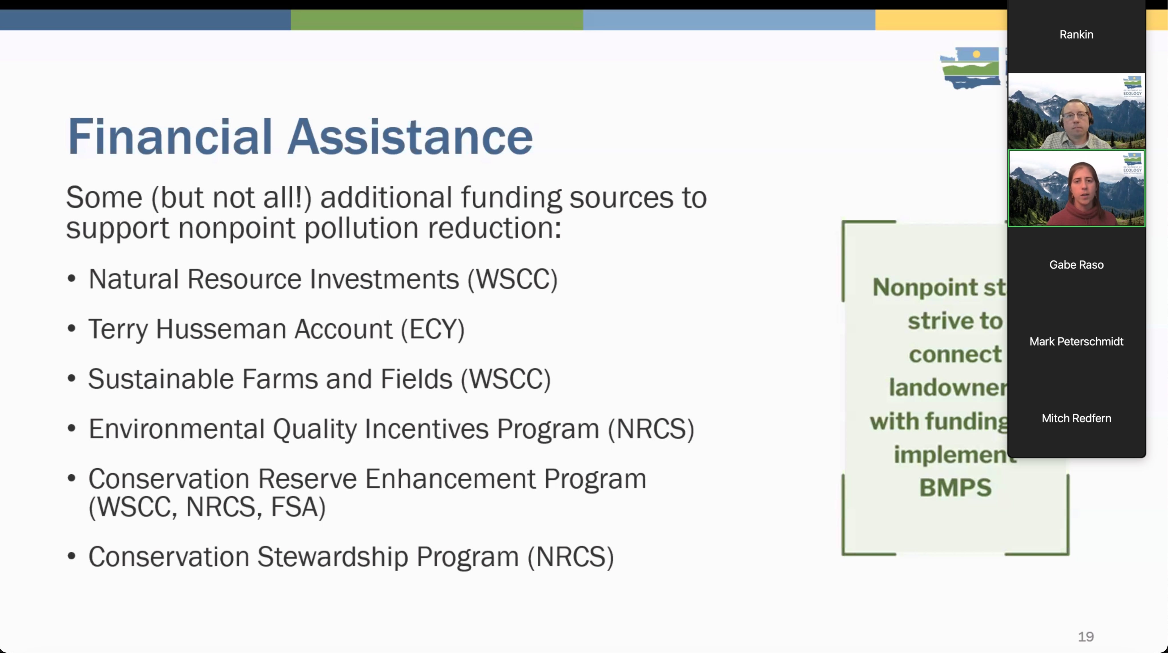 Ecology’s March 2026 presentation slides explicitly list “Buffers – Riparian Management Zones” as an eligible project under the agency’s Combined Water Quality Funding Program, projected to provide $28 million for nonpoint grants and loans. The slides also highlight additional funding sources (WSCC, NRCS, FSA, etc.) that staff “strive to connect landowners with” for BMP implementation.