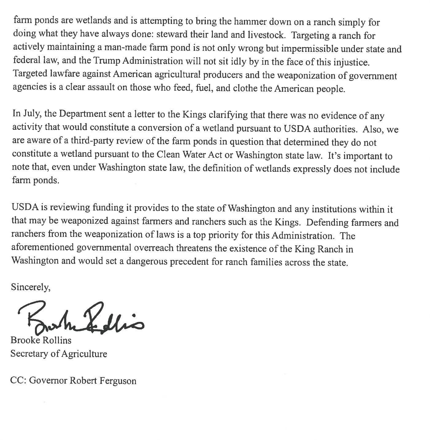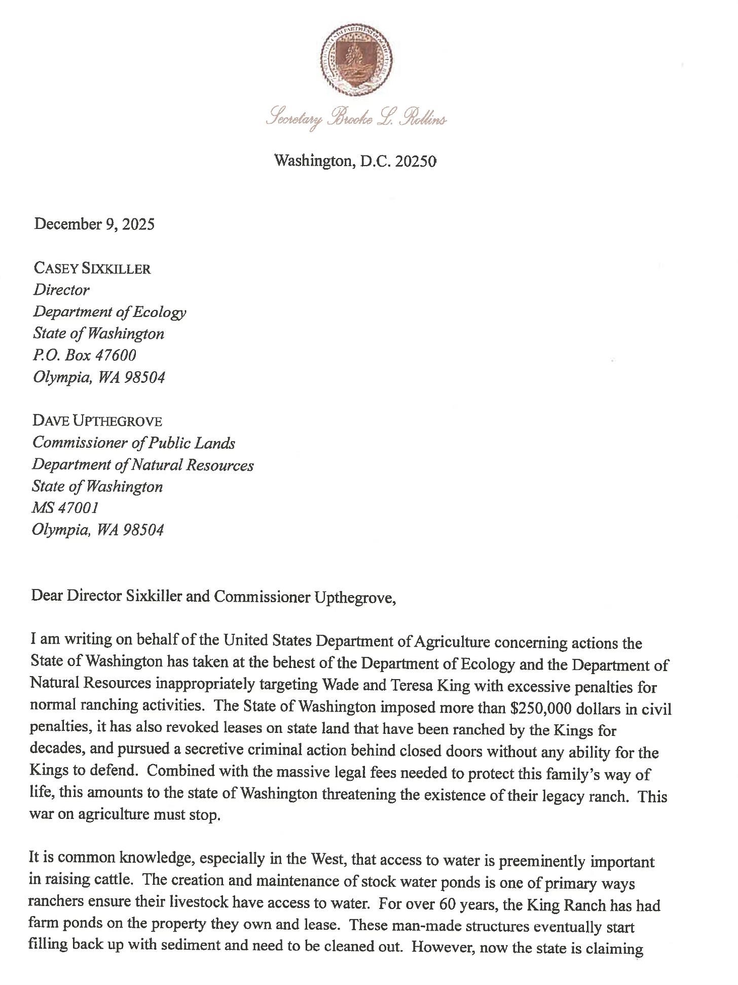 “USDA is reviewing funding it provides to the state of Washington and any institutions within it that may be weaponized against farmers and ranchers…”