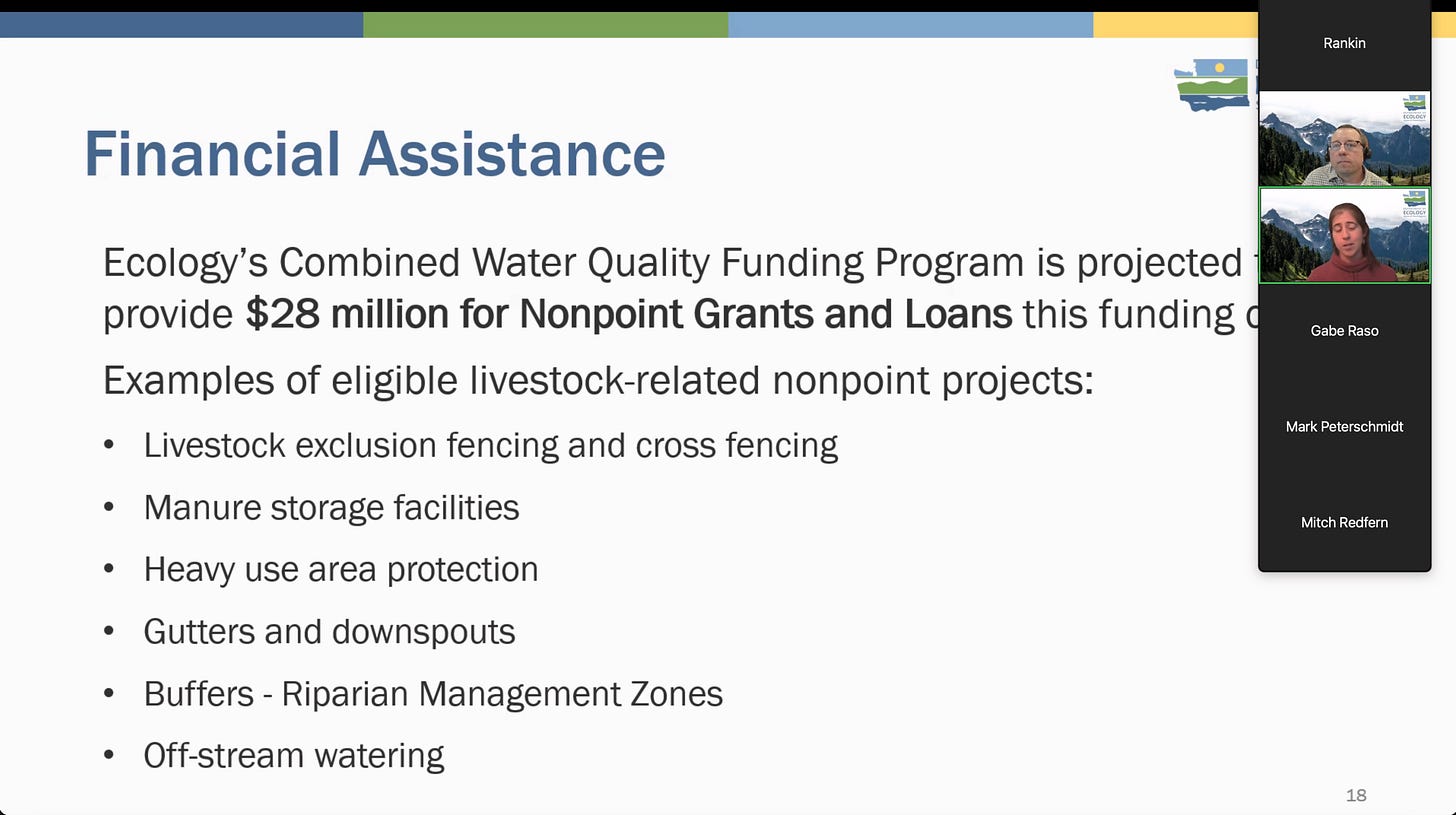 The new Voluntary Clean Water Guidance for Agriculture—final chapters submitted to EPA and in the final publication stage as of the March 11 town hall—plays a central role in these recommendations. Statewide nonpoint policy lead Hannah Coe and Ben Rao explained its function and its tie to funding: