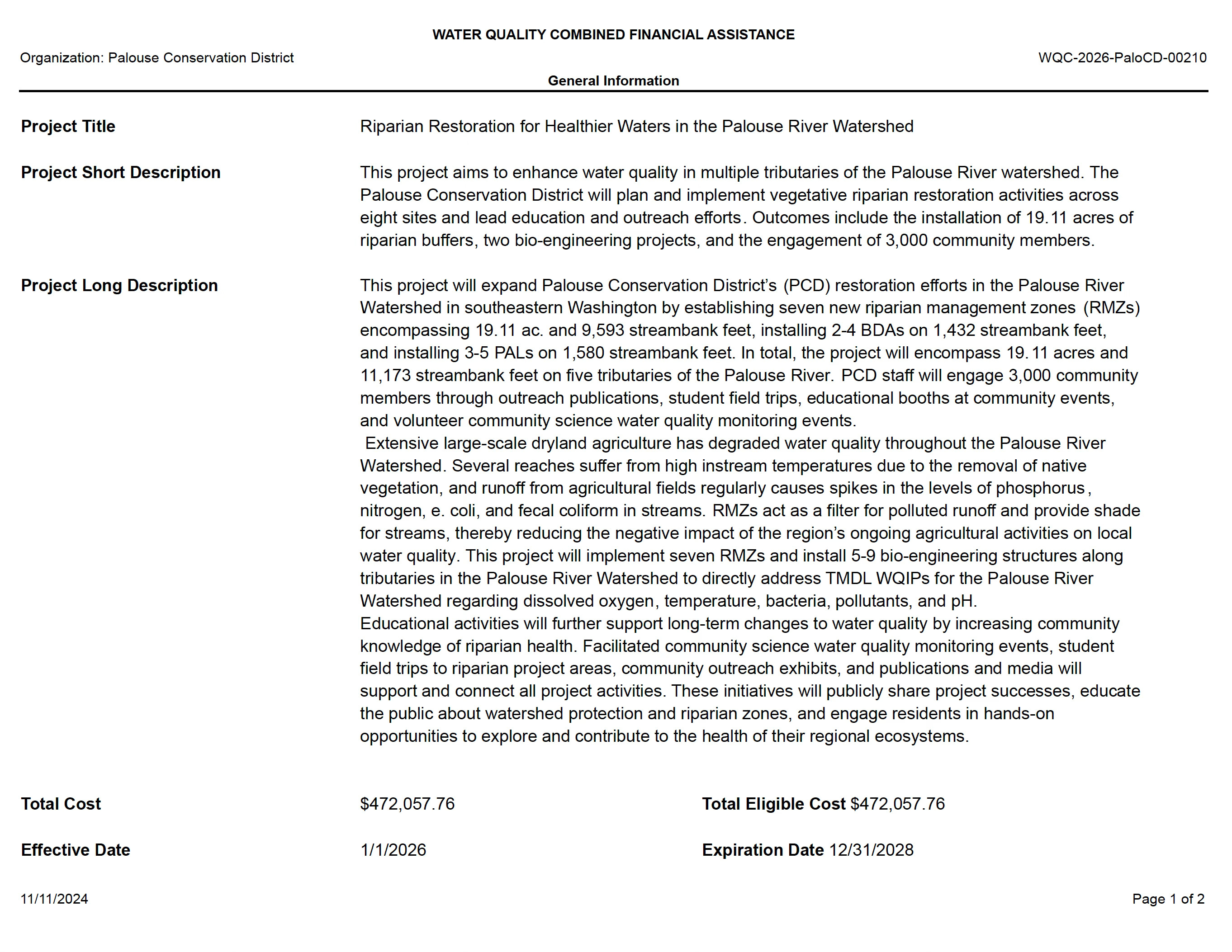 Through Clean Water Act §319, federal funds support the very conservation practices (riparian buffers, restoration) being implemented. Outcomes are reported to EPA as modeled load reductions — not direct parcel-level measurements. Palouse Conservation District grant documents show 19.11 acres of buffers tied directly to federal reporting.