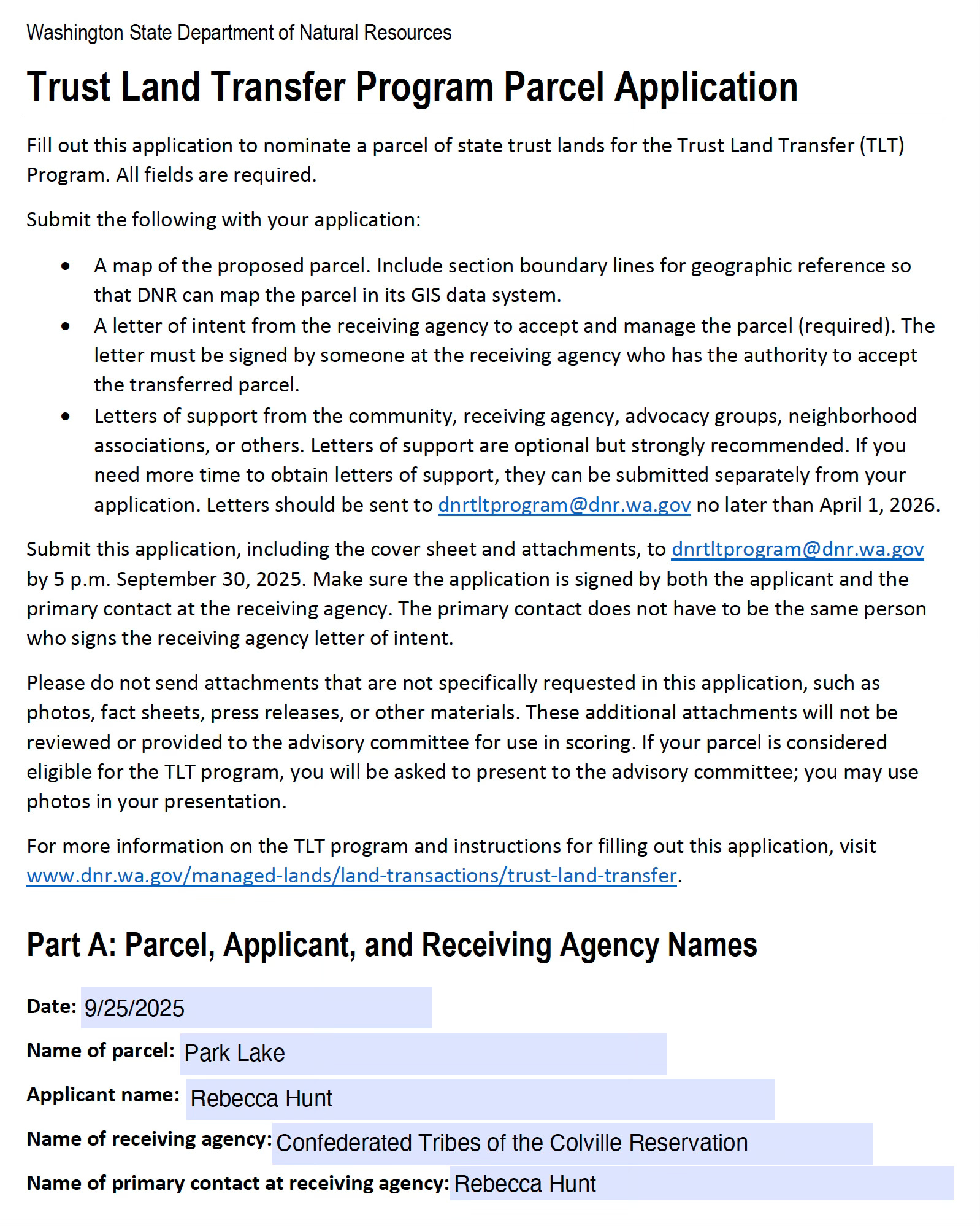 Applications for Park Lake A, B, and C are submitted for consideration in the 2027–29 Trust Land Transfer cycle by the Confederated Tribes of the Colville Reservation.