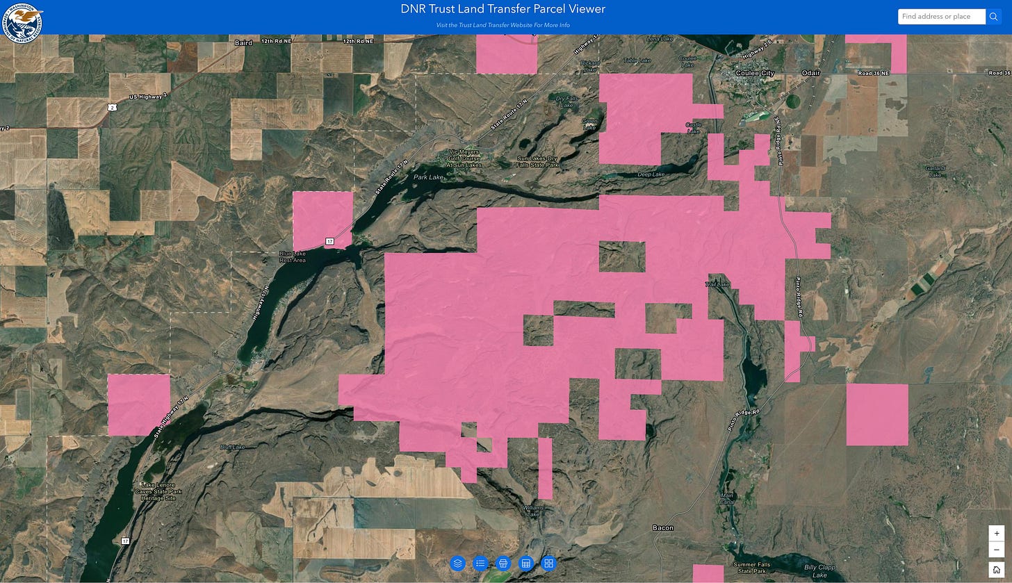 The Park Lake A, B, and C parcels — approximately 12,800 acres of shrub-steppe rangeland in Grant County — are now proposed for transfer through Washington’s Trust Land Transfer (TLT) program.