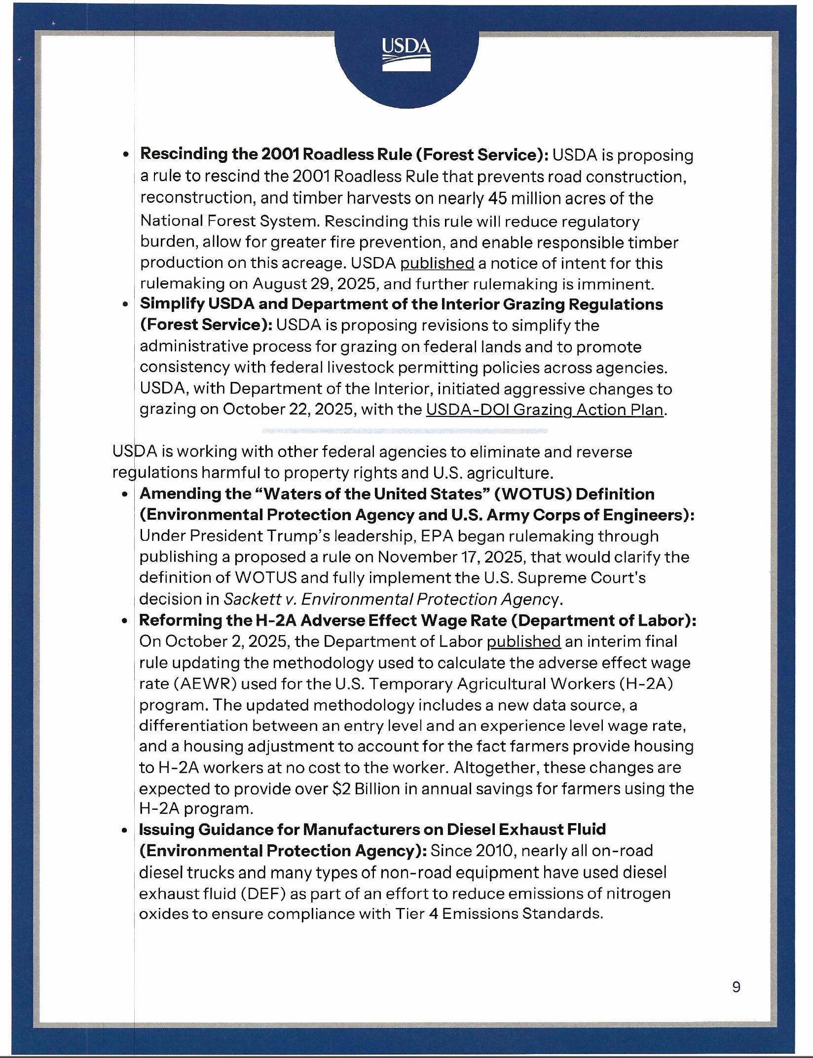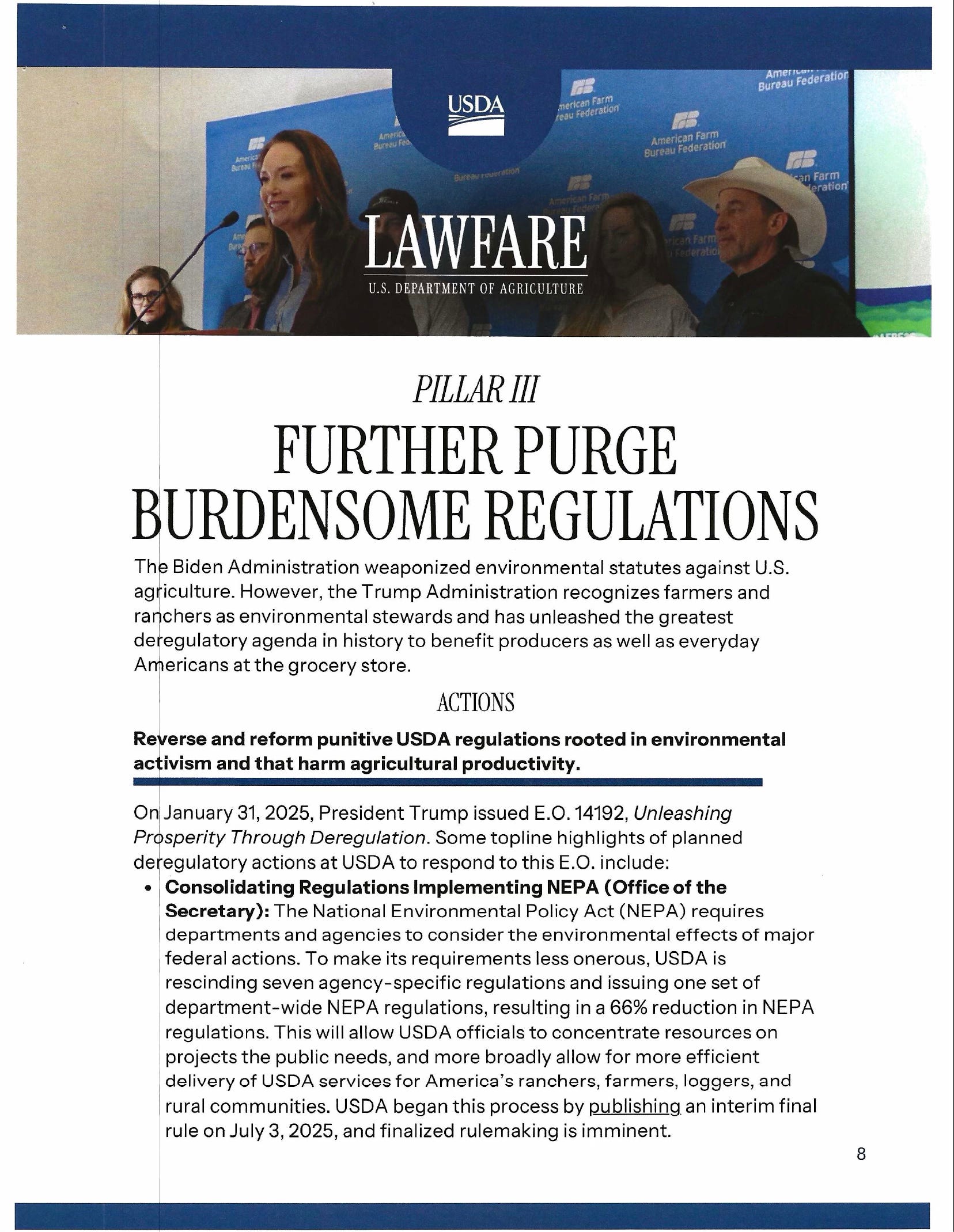 Likewise, references to forthcoming NEPA rewrites and reinterpretation of ESA “harm” language signal potential regulatory rollback in land-use and environmental review processes. Those changes, if published in rulemaking form, could materially alter the compliance landscape for agricultural operators.