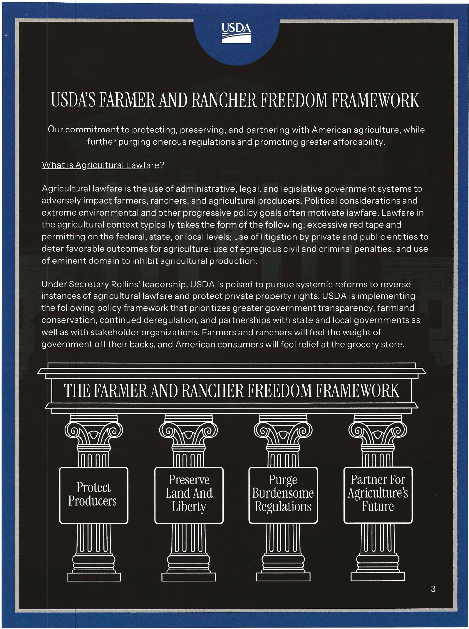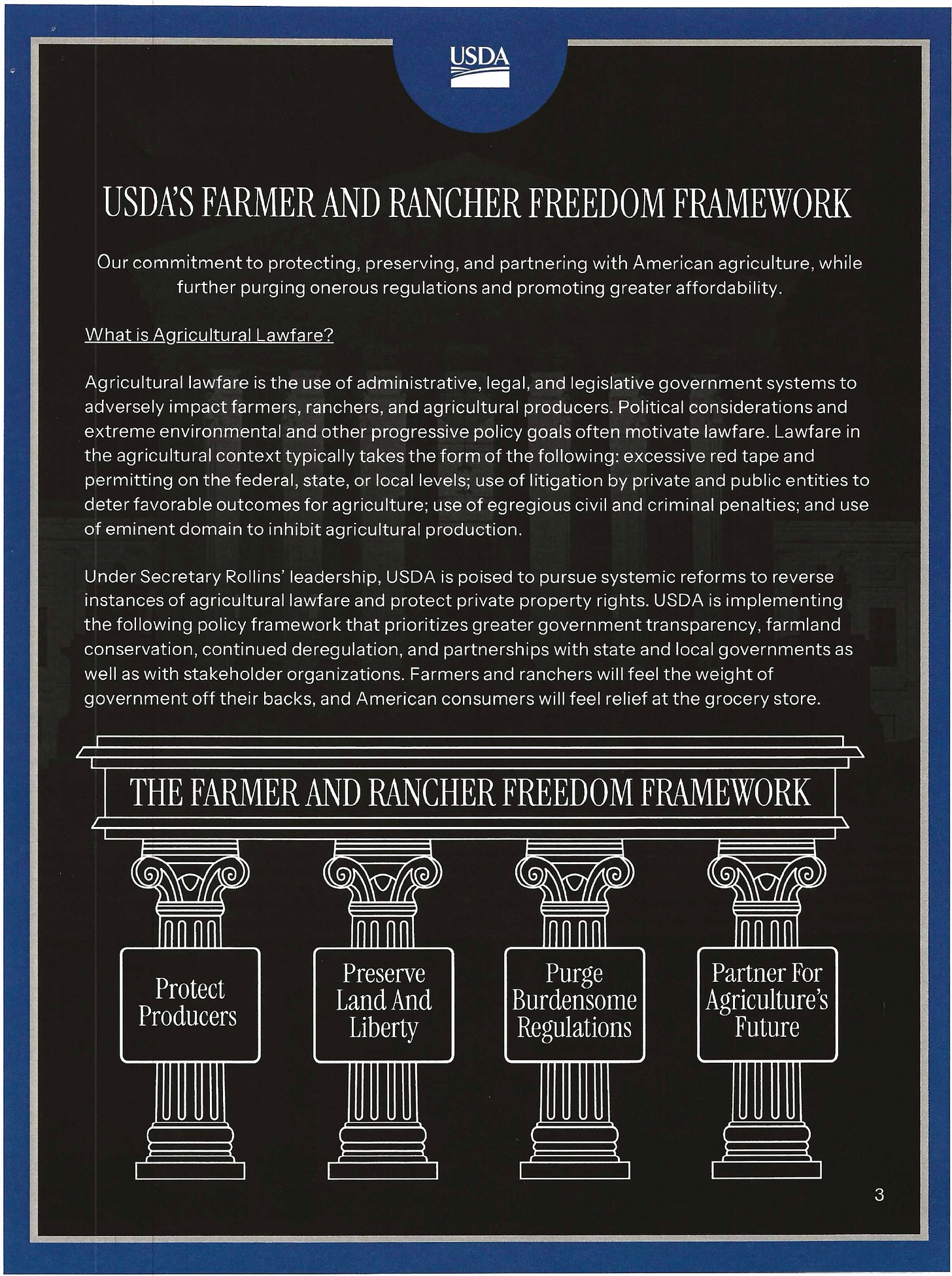 The Farmer and Rancher Freedom Framework, unveiled during the roundtable, rests on four broad pillars. While the language surrounding it was emotionally charged at times, the document itself outlines a set of administrative priorities rather than statutory reforms.