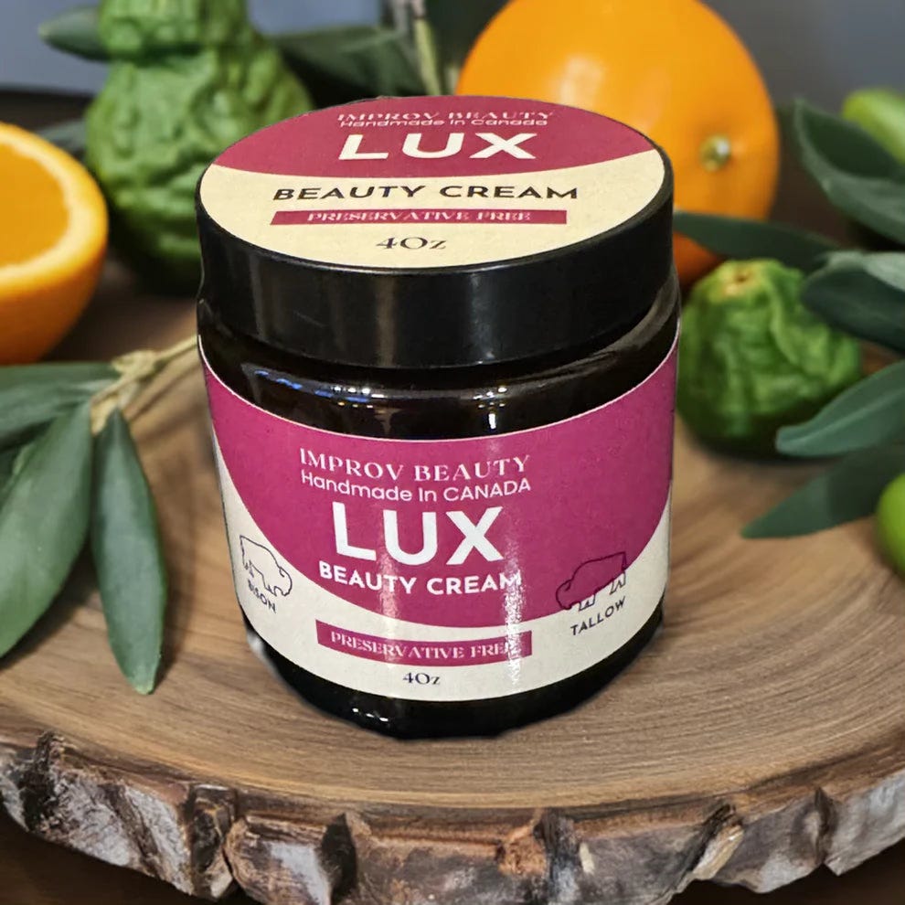 LUX Bison Tallow Beauty Cream – Our handmade cream contains bison tallow, rosehip oil, olive oil, honey, castor oil, essential oils of: Bergaptene-free Bergamot, Sweet Orange.