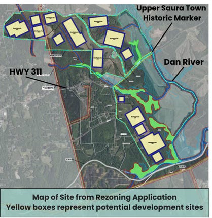 The plan was straightforward for the developers: rezone nearly 1,845 acres off US 311 near the Dan River, much of it currently residential-agricultural. The vision included warehouse-scale buildings filled with servers running 24/7, heavy power demands, and industrial infrastructure on land that has long grown crops, supported families, and held deep cultural roots.