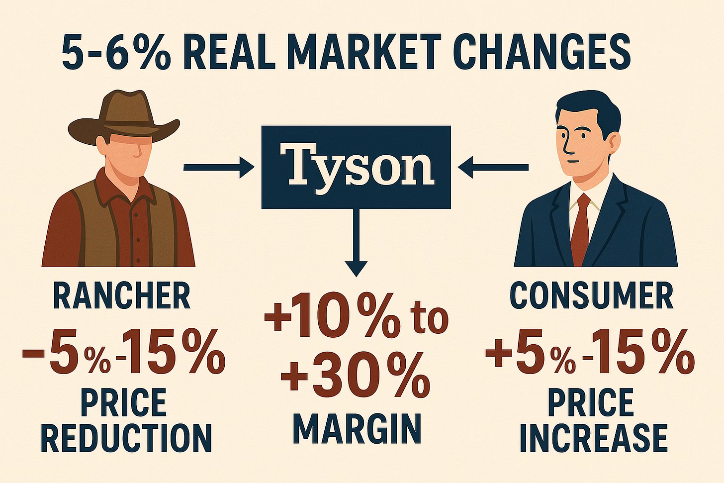 On paper, Tyson is pulling out about 5–6% of total U.S. slaughter capacity. That doesn’t sound catastrophic — until you realize how concentrated the industry is.