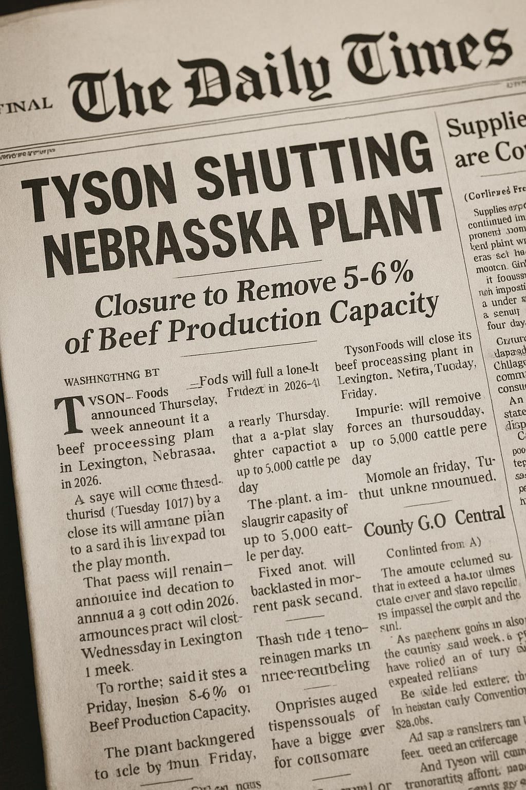 In one announcement, Tyson removed a major Nebraska slaughter hub and squeezed Texas capacity, shrinking the already-tight pipeline that moves cattle from ranch country to America’s meat counters.